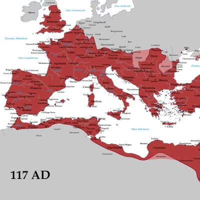 The Roman Empire around 117 CE, at its greatest extent. Greek philosophy profoundly influenced Roman thought and culture, shaping the intellectual landscape of the empire. Greek thought also had a deep impact on early Christian theology and the development of Christian philosophy. After the fall of the West-Roman Empire, Greek philosophy was preserved and transmitted both in upcoming Christianity and by Byzantine – and later Islamic – scholars, who played a crucial role in the preservation and transmission of classical knowledge. Source: Wikimedia Commonsꜛ (license: CC BY-SA 3.0)
