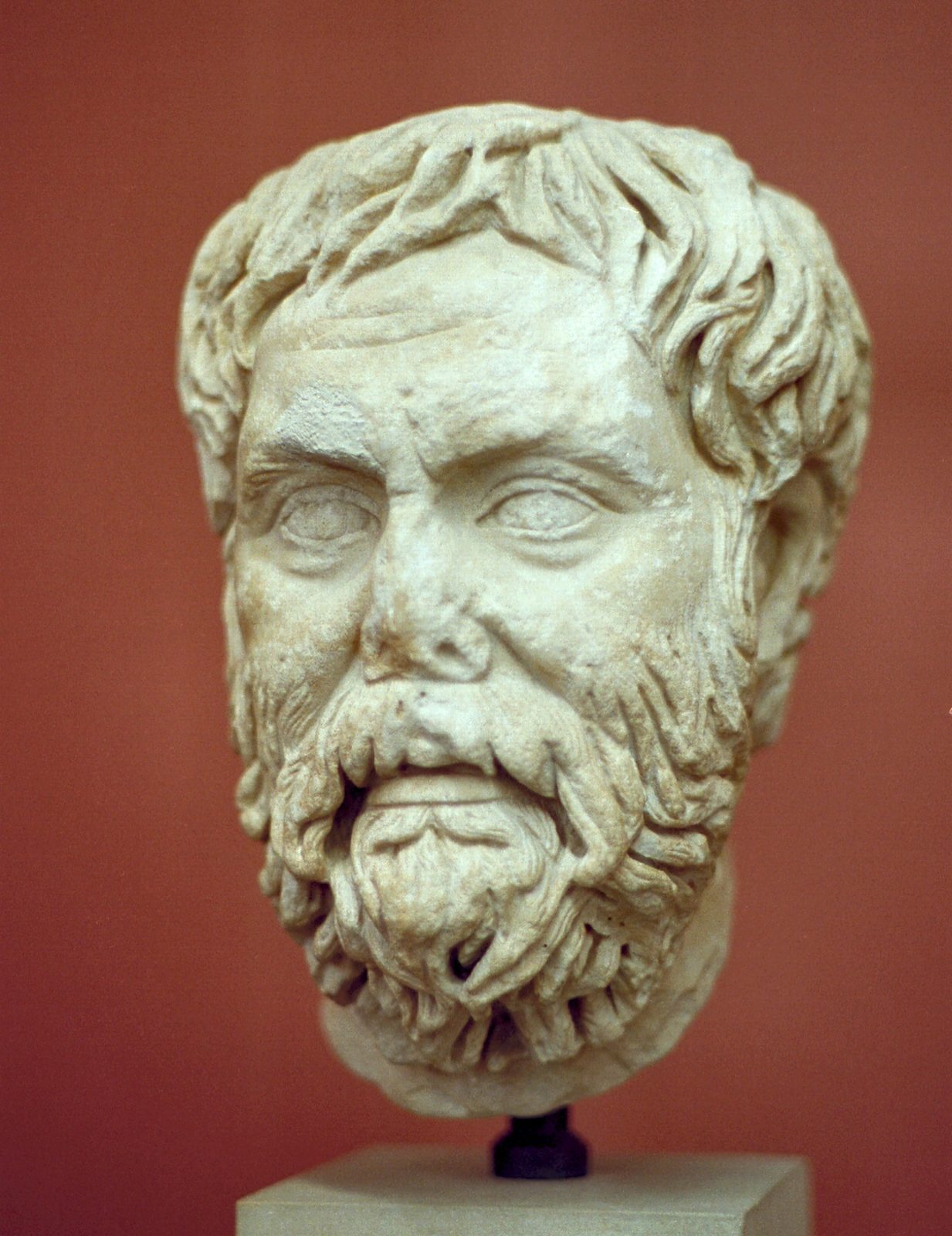 Pyrrho of Elis, marble head, early Roman copy, 2nd century BCE. Bronze Greek original was from the 4th century BCE. Source: Wikimedia Commonsꜛ (license: CC BY-SA 4.0)