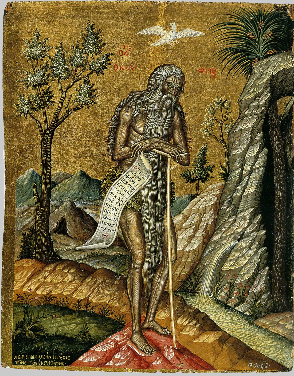 4th-century Desert Father from Ethiopia Saint Onuphrius, lived in seclusion in the desert of Upper Egypt, icon from 1662. Source: Wikimedia Commonsꜛ (license: public domain)