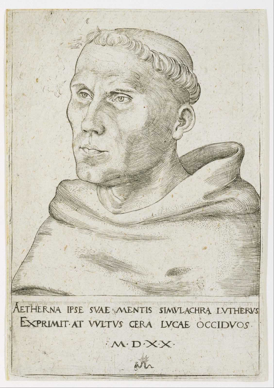 Martin Luther, Lucas Cranach the Elder, 1520, engraving, on laid paper with watermark. Source: Wikimedia Commonsꜛ (license: public domain)