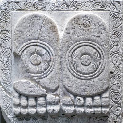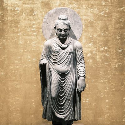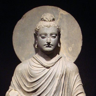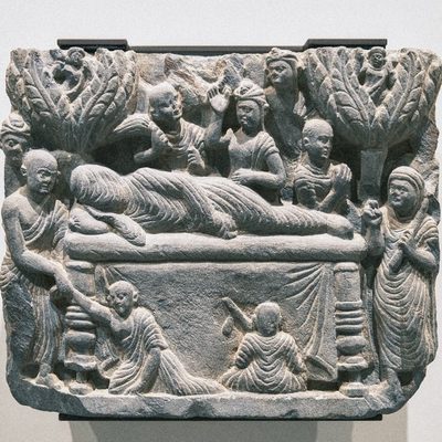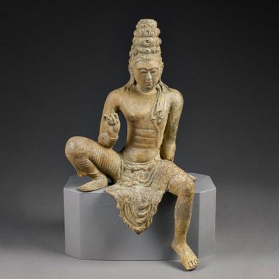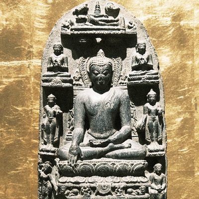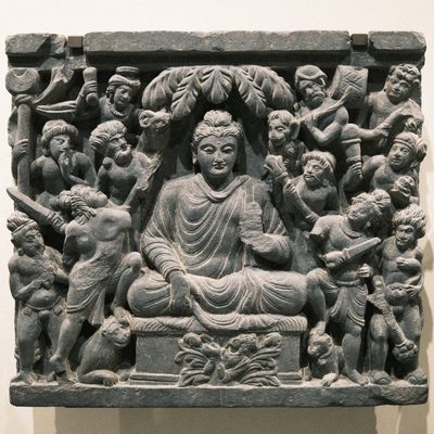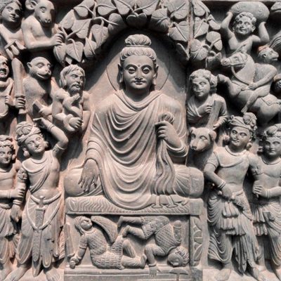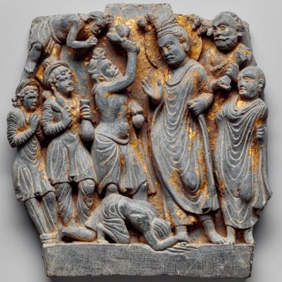 The gods Indra and Brahma entreat the Buddha to deliver his first sermon, Pakistan, Gandhara, 1st c., schist. According to early Buddhist narratives, following his awakening, Siddhartha Gautama initially refrains from teaching, concerned that the depth of his insight (prajñā) may be difficult to grasp. However, heavenly beings — represented here by Indra and Brahmā — repeatedly entreat him to share his realization for the benefit of all sentient beings. This moment symbolically marks the transition from solitary insight to compassionate action (karuṇā), and the beginning of his role as teacher. Exhibited at the Humboldt Forum in Berlin, 2023.