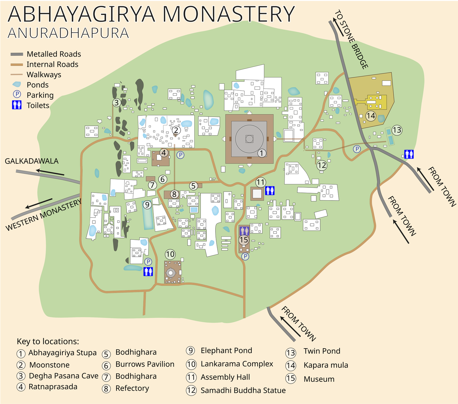 Plan of the Abhayagiriya Monastery. The monastery was founded in the 1st century BCE by King Vaṭṭagāmaṇi Abhaya and represented a more cosmopolitan and eclectic strain of Buddhism. Abhayagiri monks were reputed to have embraced elements of Mahāyāna and Vajrayāna thought and maintained ties with broader transregional networks, including Chinese and Central Asian traditions. This doctrinal diversity made the complex a vibrant site of translation, ritual experimentation, and scholastic exchange. Source: Wikimedia Commonsꜛ (license: CC BY-SA 3.0)