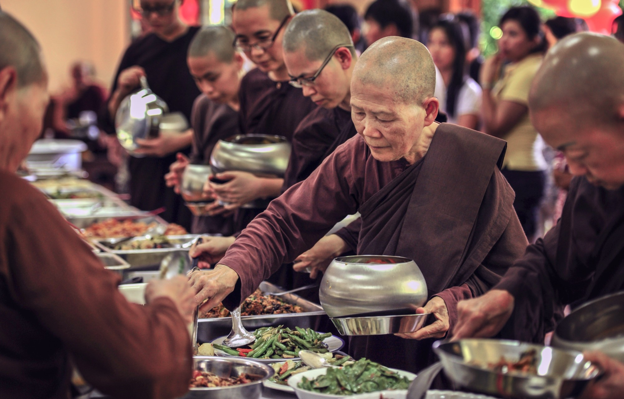 Buddhist monks during a meal. Buddhism does not universally mandate vegetarianism, but many traditions advocate it as an expression of compassion and non-harming. Source: pxhere.comꜛ (license: CC0ꜛ)
